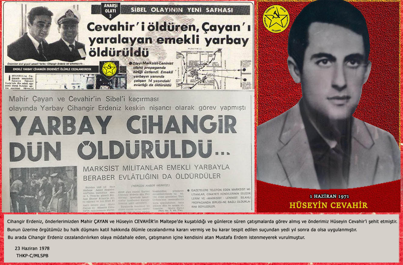 Cihangir Erdeniz, önderlerimizden Mahir Çayan ve Hüseyin Cevahir’in Maltepe’de kuşatıldığı ve günlerce süren çatışmalarda görev almış ve önderimiz Hüseyin Cevahir’i şehit etmiştir. Bunun üzerine örgütümüz bu halk düşmanı katil hakkında ölümle cezalandırma kararı vermiş ve bu karar tespit edilen suçundan yedi yıl sonra da olsa uygulanmıştır. Bu arada Cihangir Erdeniz cezalandırılırken olaya müdahale eden, çatışmanın içine kendisini atan Mustafa Erdem istenmeyerek vurulmuştur.